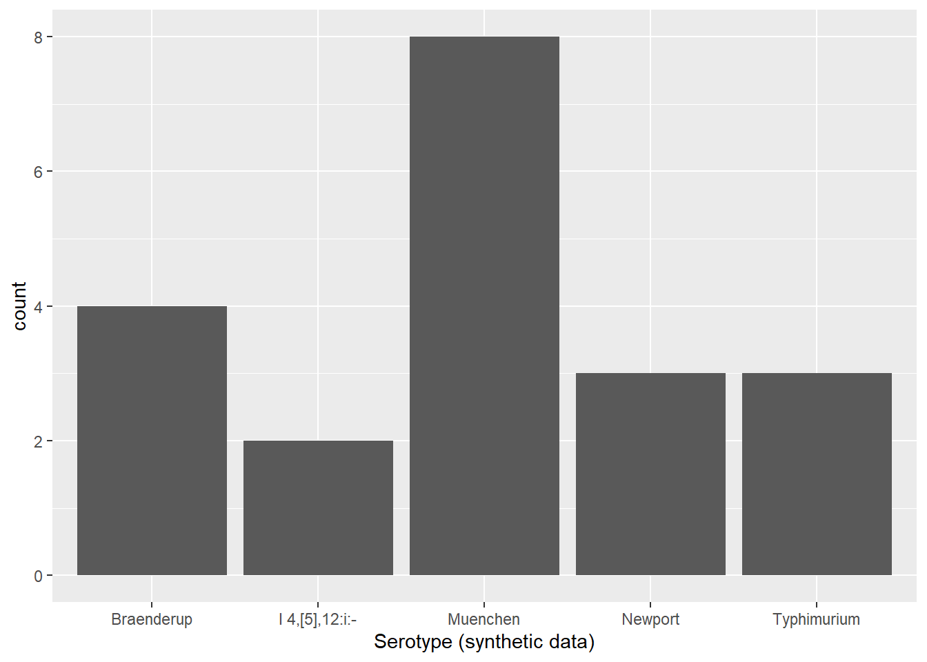 #renaming the serotypes from my synthetic data, so the plots can have the correct axis names#Before I did this, the plots were blank. I asked AI why they were blank and it was because the variable names didn't match, which is why I recoded them.synthetic_data <- synthetic_data %>%mutate(Serotype =recode( Serotype,"Serotype 1"="Typhimurium","Serotype 2"="Braenderup","Serotype 3"="Muenchen","Serotype 4"="Newport","Serotype 5"="I 4,[5],12:i:-" ) )