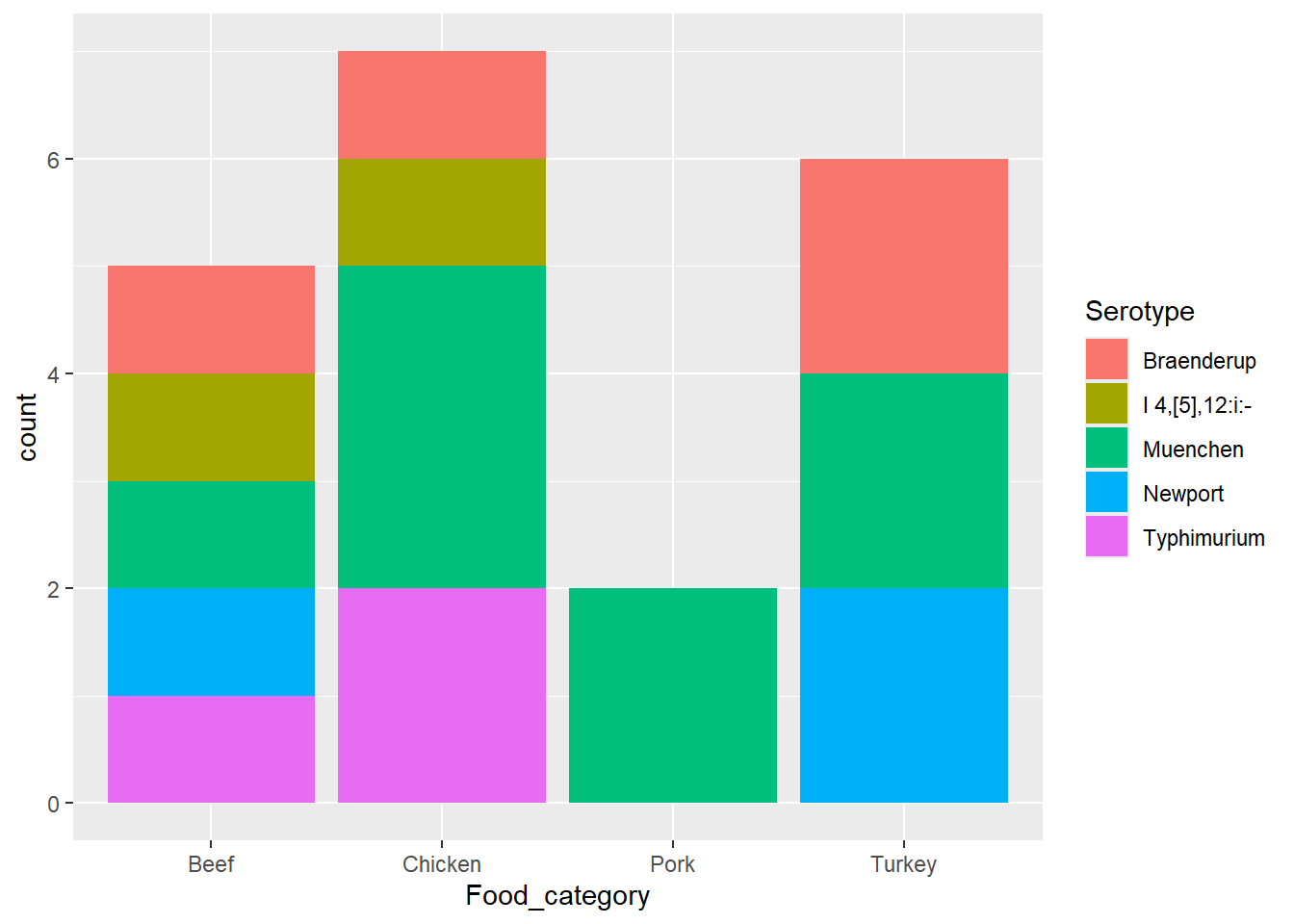 p3 <-ggplot(plot_subset, aes(x = Food_category, fill = Serotype)) +geom_bar() +labs(x ="Food_category", y ="count", fill ="Serotype")p3