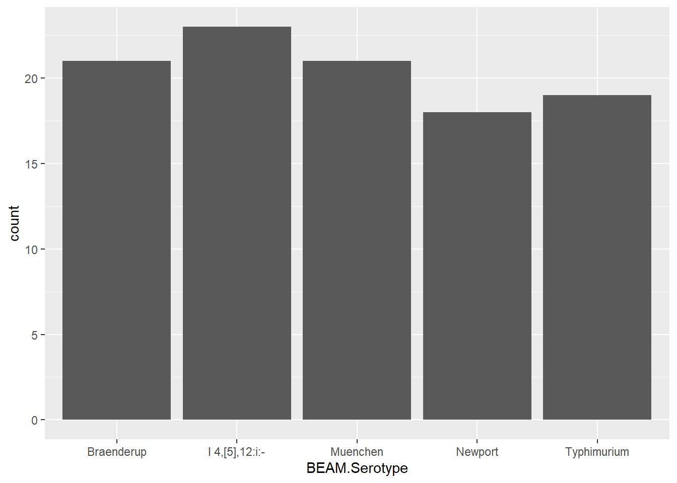 I can now see that the most common serovars are monophasic Typhimurium (I 4,5,12,:i:-), Braenderup, Muenchen, Enteritidis, Typhimurium, and Newport.