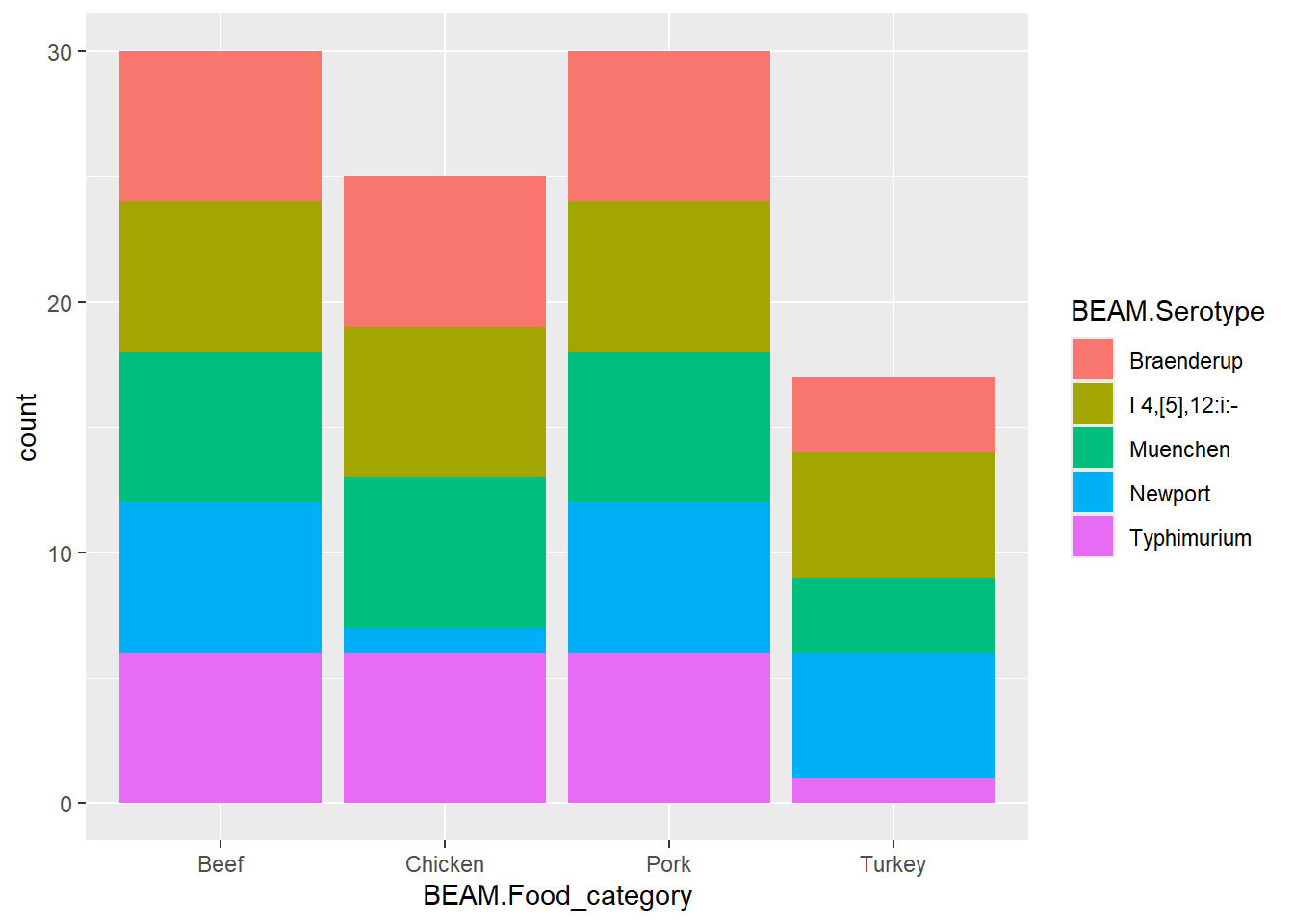 #Created a subset for the plots to have the same plotsplot_subset <-subset( synthetic_data, Food_category %in%c("Beef", "Chicken", "Pork", "Turkey") & Serotype %in%c("Typhimurium","Braenderup","Muenchen","Newport","I 4,[5],12:i:-" ))