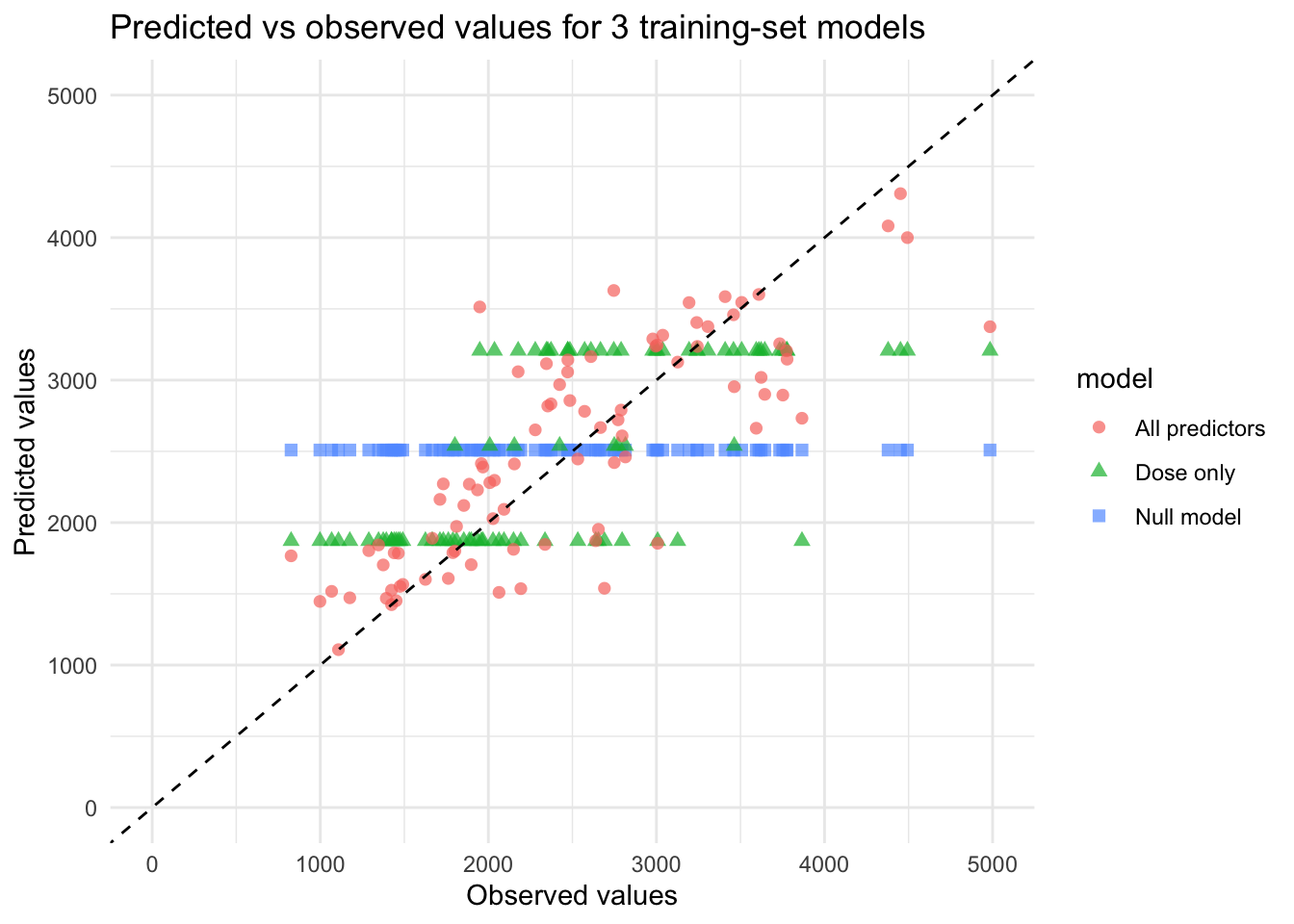 lm_mod2 <-linear_reg()lm_fit2 <- lm_mod2 %>%fit(Y ~ DOSE * AGE * SEX * WT * HT * RACE, data = df7)lm_fit2