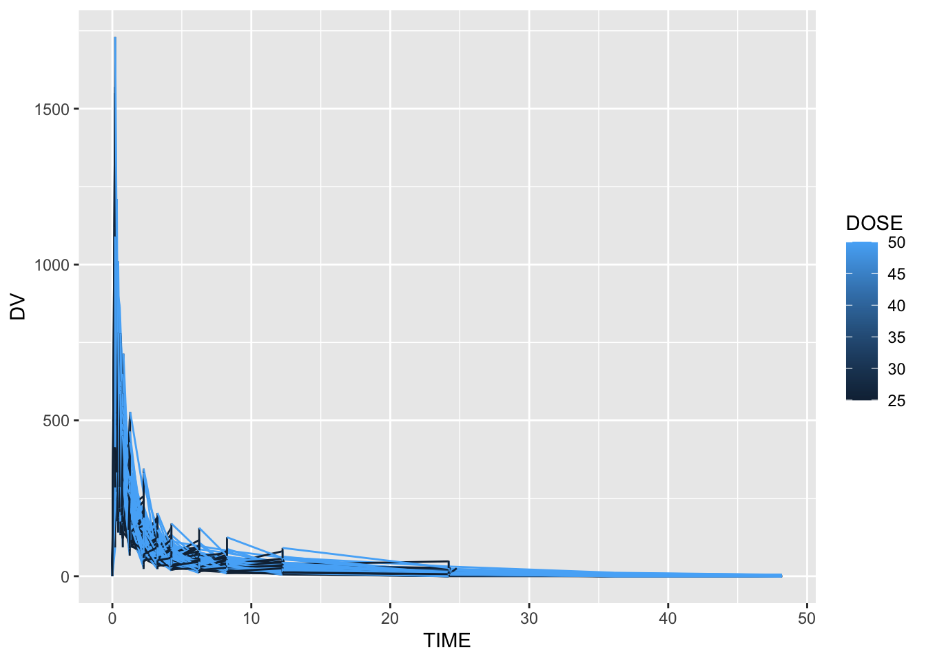 Exclude all Time=0, found sum of DV for each ID, create a new data frame with only time 0 and a new variable Y that contains amount of drug delivered over the whole experiment